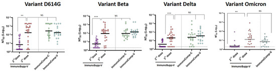 Antibody-mediated neutralization effectiveness of sera from the three groups tested against SARS-CoV-2 variants D614G, Beta, Delta, and Omicron (BA.1). NT50 represents the serum dilution resulting in 50% virus neutralization. Neutralization assay was performed using serum samples obtained from double- or triple-BNT162b2 vaccinated immunocompromised allogeneic HSCT recipients (ImmunoSupp-V), non-vaccinated immunocompetent convalescent individuals (ImmunoComp-C), and double-BNT162b2-vaccinated healthy immunocompetent individuals (ImmunoComp-V). Negative titers were handled as 0.5. Statistical significance was calculated by two-tailed, paired Student’s t tests. Asterisks indicate p-values as **: p < 0.01, and ***: p < 0.001. NS: Not significantly different.
