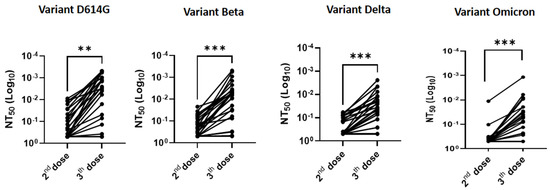 Changes in serum-neutralizing effectiveness against variants D614G, beta, delta, and Omicron (BA.1) after a third dose of BNT162b vaccine compared to post-second vaccine dose in allogeneic HSCT recipients from the ImmunoSupp-V group. The experiments were performed in triplicate. Asterisks indicate p-values as **: p < 0.01 and ***: p < 0.001.