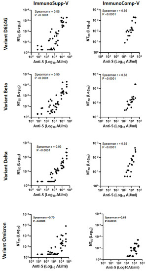 Our findings have several potential practical implications: (i) Commercially available assays can reliably be used to quantify the anti-S-RBD antibody response in serum, as a reliable surrogate marker of humoral immune protection against circulating VOCs in both immunocompetent and immunocompromised individuals; (ii) increasing anti-S-RBD antibody titers generated after the third vaccine dose in immunocompromised patients correlate with higher neutralizing potency against variants Beta and Delta but an insufficient response against Omicron. In the context of Omicron circulation, these results further emphasize the need for reinforcement of preventive measures including the administration of active monoclonal antibodies in this high-risk population.