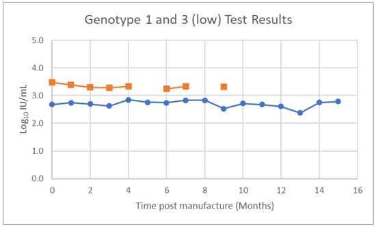 Results of monthly testing of whole blood dried tube samples for HCV Genotype 3 (blue) stored at −20 °C for 15 months, and Genotype 1 (orange) stored for nine months. Invalid results were obtained for Genotype 1 for the 5th and 8th month.