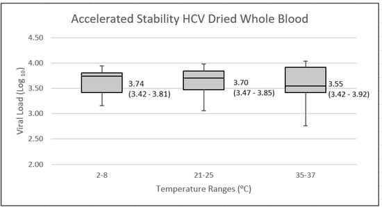Box and whisker graph of HCV viral load results of dried tube samples store at various temperatures over a six-to-nine-month period. Media (quartile 1 and quartile 3) results, expressed in log10 IU/mL are presented.