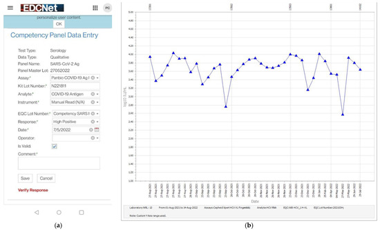 An image of the NRL Competency Panel mobile phone enabled result entry form (a) and representative Levey–Jennings Chart representing normal variation over time. X axis indicates the date of testing and Y axis indicates the Log10 IU/mL result. The change of reagent batch is displayed at the top of the graph. No acceptance limits are represented but would be displayed by horizonal bars across the graph at the upper and lower ranges (b).