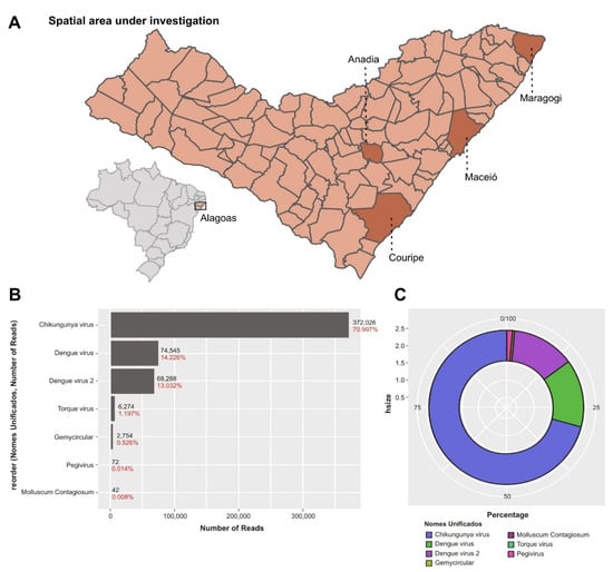 Area of investigation and metagenomic analysis of the analyzed pool of samples. (A) Map representing the spatial area under investigation and position of state of Alagoas in Brazil. (B) Bar-plots illustrating the relative abundance of viral reads for the most presented viral agents in the metavirome of the tested patients with predominance of Chikungunya and Dengue viral reads and other commensal viruses, forming part of the normal metavirome. (C) Circular representation of the relative viral abundance; Chikungunya and Dengue viruses are highly present.
