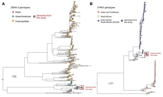 The assembled genomes of DENV-2 and CHIKV were also analyzed using phylogenetic inference. The phylogenetic analysis of the DENV-2 genome showed that it belongs to the Asian/American genotype (Figure 2A). The obtained isolate was grouped in a monophyletic cluster with other Brazilian DENV-2 strains obtained from a large outbreak of this virus in Brazil during 2019–2020, mostly circulating in the state of São Paulo. The CHIKV phylogenetic reconstruction showed that our strain belonged to the ECSA genotype, which is the most prevalent in Brazil. Additionally, the strain clustered together with other strains circulating predominantly from the northeast part of Brazil, where our samples were also obtained (Figure 2B) and frequent CHIKV outbreaks occur.