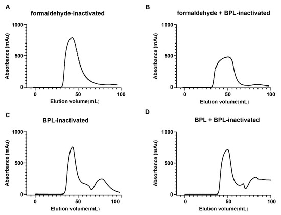 The infectivity of the viral supernatants was measured by CPE. Our results demonstrate that all four inactivation methods were efficient at inactivating the virus completely (data not shown). Firstly, we purified the virus and examined the homogeneity of the viral particles treated with different inactivation methods using size exclusion chromatography. The results showed that the UV absorption curves of formaldehyde-inactivated and formaldehyde + BPL-inactivated groups were wide and flat (Figure 1A,B). The UV absorption curves of the BPL-inactivated and BPL + BPL-inactivated groups were narrow and sharp (Figure 1C,D). These results indicate that formaldehyde-inactivated and formaldehyde + BPL-inactivated treatments affect the dispersity and homogeneity of the viral particles. The remaining two inactivation methods had less of an impact on the physical properties of the viral proteins.