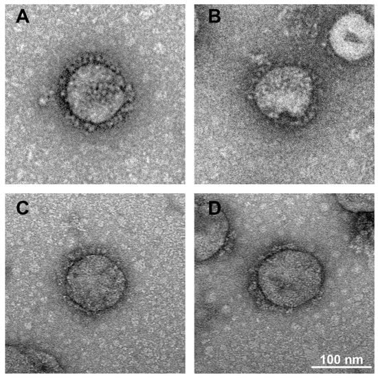 Electron microscopy has been used to evaluate the structural characteristics of inactivated SARS-CoV-2 [21]. To test whether SARS-CoV-2 undergoes morphologic changes during formaldehyde or BPL treatment, we used an electron microscope to study the virus morphology. Viral supernatant treated with formaldehyde or BPL was analyzed via negative staining. As is shown in Figure 2A–D, the virus particles treated with different inactivation methods have normal morphological structures and crown shapes. These results indicate that formaldehyde and BPL treatment have little impact on the morphological structure of SARS-CoV-2.