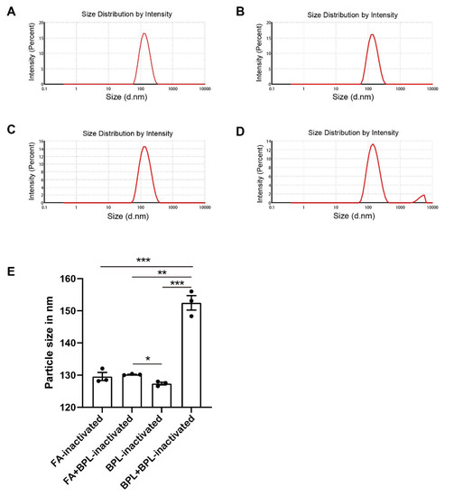 Dynamic light scattering (DLS) analysis graphs of different inactivated virus samples: (A) Formaldehyde-inactivated (FA-inactivated). (B) Formaldehyde + BPL-inactivated (FA + BPL-inactivated). (C) BPL-inactivated. (D) BPL + BPL-inactivated. (E) Dynamic light scattering (DLS) results of different inactivated virus samples. FA, formaldehyde. * p < 0.05, ** p < 0.01 and *** p < 0.001 were defined as statistically significant.