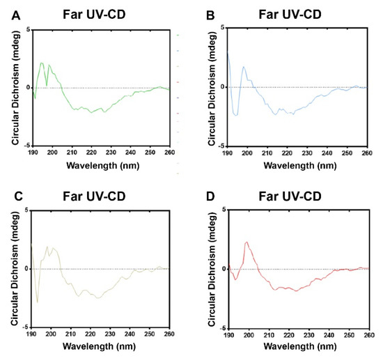 Circular dichroism (CD) spectroscopy analysis charts of different inactivated virus samples. (A) Formaldehyde-inactivated virus samples. (B) Formaldehyde + BPL-inactivated virus samples. (C) BPL-inactivated virus samples. (D) BPL + BPL-inactivated virus samples.