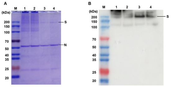 The protein samples were denatured via boiling for 10 min and loaded onto SDS-PAGE for electrophoresis. The gel was transferred to a PVDF membrane at 50 V for 2 h and closed using 5% BSA, followed by the addition of 1/1000-diluted SARS-CoV-2 spike primary antibody (40591-T62, Sino Biological, Beijing, China) overnight. It was then washed three times using PBST (PBS: Tween = 1000:1), incubated for 1 h with 1/10,000-diluted IgG secondary antibody (17294442, Cytiva, Marlborough, MA, USA), washed three times using PBST, and incubated using ECL. The luminescent image was detected using Amersham ImageQuant 800.