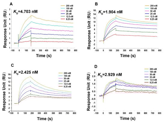 The SPR method is commonly used for detecting antigen–antibody affinity [22]. To further evaluate the impact of different inactivation methods on the immunological properties of SARS-CoV-2, we performed SRP experiments. We used the SARS-CoV-2 spike chimeric monoclonal antibody to examine the equilibrium dissociation constants for viruses treated with four different inactivation methods. The results showed that the affinities of the viruses treated by the four inactivation methods to the SARS-CoV-2 spike chimeric monoclonal antibody D002 were all at the nanomolar level, with no significant differences between them (Figure 6A–D, Supplementary Figure S1). These results indicate that formaldehyde and BPL treatment made no significant difference to the affinity of SARS-CoV-2 for S monoclonal antibody.
