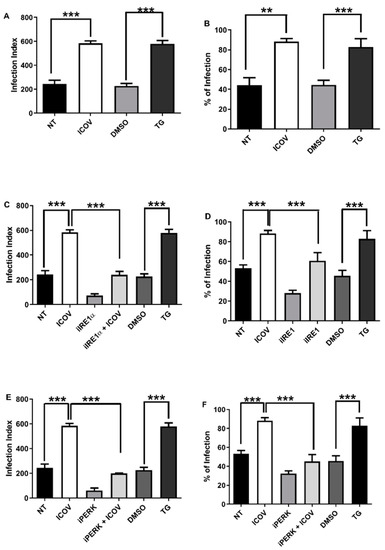 Viral infections induce and may require ER the stress response to replicate inside infected cells [32,33]. We decided to test whether the inhibition of IRE1α or PERK would affect the exacerbated parasitic growth due to ICOV coinfection. Figure 2A,B confirms our previous findings on increasing the L. amazonensis load and the number of infected macrophages upon viral coinfection, which is comparable with the induction of ER stress by thapsigargin. Then, we tested the role of IRE1α in the context of coinfection. Figure 2C,D shows the reduction of the parasite load by the inhibitor, even in the presence of ICOV.