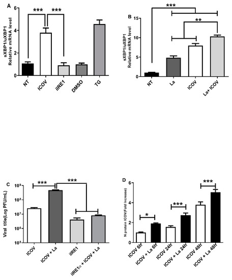 3.3. The ER Stress Branch IRE1α/XBP1 Is Required for ICOV Replication, and It Is Augmented and Sustained during Coinfection
