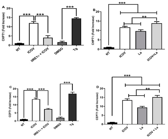 The expansion of the ER demands phospholipids, such as phosphocholine, which is abundant in mammalian cell membranes [35]. Since XBP1 regulates a set of genes involved in the phospholipid synthesis, we decided to address whether the ER stress-induced during the infection by ICOV and L. amazonensis would upregulate the expression of the cholinephosphotransferases CPT1 and CEPT1enzymes, which regulate the final steps of the Kennedy pathways [36]. Figure 4A,B shows the augmented mRNA levels of CHPT1 during ICOV infection and upon the coinfection, respectively. Notably, the coinfection resulted in a slight but significant increase in the expression compared to the single infection by L. amazonensis or ICOV. In Figure 4C,D, we observed a similar mRNA expression profile for CEPT1. Significantly, the chemical inhibition of IRE1α abolished the expression of CHP1 and CEPT1. The enhanced expression of CHPT1 and CEPT1 is sustained for 24 h after coinfection (Figure S3A–D).
