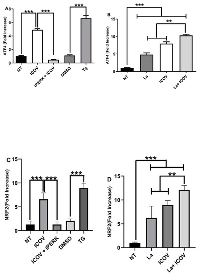 Then, we addressed if ICOV and the coinfection with L. amazonensis would increase the mRNA levels of ATF4 and NRF2, regulated by the ER stress sensor PERK. Figure 5A,B, respectively, shows the ICOV upregulation of ATF4 and enhanced levels during the coinfection. NRF2 is a master transcription factor that regulates the expression of genes involved in the antioxidative stress response [37], induced via the PERK/ATF4 pathway. Figure 5C,D shows the upregulation of NRF2 by ICOV expression due to the coinfection. The pharmacological inhibition of PERK diminished the mRNA levels of ATF4 and NRF2, thus demonstrating the dependence of PERK activation. We observed a significant increase in ATF4 and NRF2 mRNA levels during the coinfection, which is sustained for 24 h, suggesting the potentiation of the antioxidative response in this condition. (Figure S4A–D).