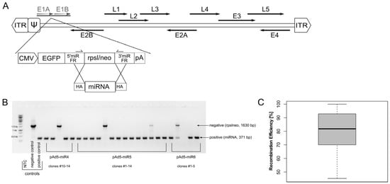 In this study, we set up an easily accessible and efficient adenoviral vector platform for miRNA expression. A bi-cistronic expression cassette encoding for a double-stranded pri-miRNA of interest and a reporter gene (EGFP) under the control of a constitutive polymerase II promoter (CMV) was inserted into the E1-deleted region of Ad5 (Figure 1A) [66]. The sequence encoding for nonsense miRNA (miRscr) was replaced with a counter-selection marker (rpsl/neo). This construct served as a platform for the insertion of different miRNAs. To demonstrate the straightforwardness of this cloning strategy, we have inserted 13 different miRNAs and screened for positive clones using diagnostic primers located within the 5′- and 3′-miRNA-flanking regions (5′-/3′-miR FR, Figure 1A). In contrast to screening approaches based on restriction enzymes, the PCR screening assay enabled the fast and accurate identification of correct clones (Figure 1B) and revealed a high insertion efficiency. Correct clones were obtained with an efficiency of 80.6% (±16.7%) (Figure 1C, Table 1).