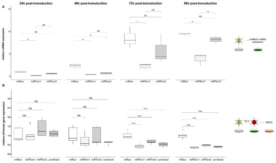 To prove the vector platform’s applicability, we established a two-vector system for miRNA-targeting validation. Two miRNAs targeting the red fluorescent protein tdTomato were tested, and a nonsense-miRNA (miRscr) served as a control. The resulting vectors Ad-miRTom1, Ad-miRTom2, and Ad-miRscr were used to determine the miRNA-expression levels exemplarily, both in a dose-dependent and time-dependent manner. Further, their potency of target gene downregulation was analysed. The expression of target mRNA and all three miRNAs (miRscr, miRTom1, and miRTom2) were analysed 24, 48, 72, and 96 h post-transduction (hpt). MicroRNA-expression levels were normalised to miRscr levels at 24 hpt. Surprisingly, distinct differences in miRNA expression were noticed. Overall, nonsense miRNA miRscr showed elevated expression levels compared to miRTom1 and miRTom2 at all time points (Figure 2A), while no significantly different expression levels were observed for miRTom1 and miRTom2 at 24, 48, and 72 hpt. However, all miRNAs seemed to accumulate in the cell over time, with a 9.5 ± 0.26-fold increase in miRNA abundance for miRscr and a 13.6 ± 1.36-fold increase in miRNA abundance for miRTom2 at 96 hpt. Although miRTom1 showed comparable low expression levels, an increased accumulation compared to miRscr and miRTom2 (96 hpt: 21.3 ± 7.73-fold increase over 24 hpt) was detected. In contrast, only minimal oscillation of EGFP mRNA-level between the different miRNA-expressing vectors and time points was detected (Figure S1).