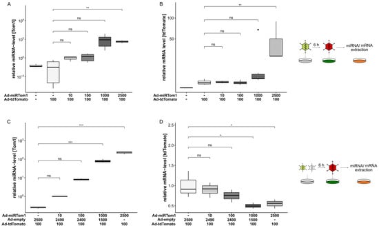Dose-dependent expression of miRNA and targeting. A549 cells were transduced with Ad-tdTomato (MOI 100) and escalating MOIs of Ad-miRTom1. Expression levels of miRTom1 and target RNA were analysed in quantitative PCR. (A,C) Expression of CMV-driven miRNA (miRTom1) was scalable and correlated with physical adenoviral vector particles used for transduction (C: MOI 100: 9.7-fold expression over MOI 10; MOI 1000: 72.4-fold expression over MOI 10; MOI 2500: 220.2-fold expression over MOI 10; r2 = 0.98). (B) Escalating doses of Ad-mirTom1 resulted in increased mRNA levels for tdTomato (44.5 ± 39.9, p = 0.006). (D) Complementation of applied physical Ad-miRTom1 vector particles with Ad-empty to an MOI 2500 resulted in dose-dependent downregulation (up to 50% reduction, p = 0.02) of target mRNA. Significance values were calculated with Dunnett’s test. MOIs (multiplicity of infection) were applied as indicated. ns, p > 0.05; *, p < 0.05; **, p < 0.01; ***, p < 0.001.
