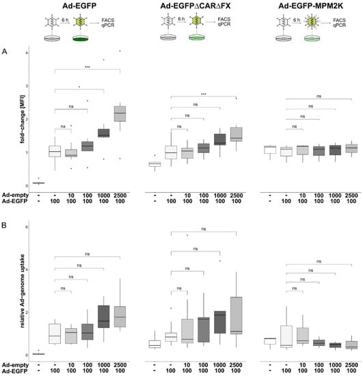 To determine whether the initially observed increase in target mRNA resulted from either a dose-dependent increase in particle uptake or alterations in intracellular trafficking, cells were transduced with different MOIs of a non-expressing vector (Ad-empty) followed by transduction with EGFP-expressing vectors harbouring different capsid modifications. The genome copies per cell and transgene expression were determined by qPCR and flow cytometry to distinguish between the vector uptake into the cell and transport to the nucleus. Pre-treatment of the cells with an increasing number of Ad-empty particles resulted in an increased expression of the transgene EGFP that was delivered with a wildtype (wt) capsid Ad vector (Ad-EGFP; 2.2-fold ± 0.9, p < 0.001; Figure 4A, left panel). A similar effect was observed for an EGFP-expressing vector ablated for binding to its natural Coxsackievirus and adenovirus receptor (CAR) and factor X (FX). Two point mutations located in the fiber knob (Y477A, ∆CAR) and hexon (T425A, ∆FX) hinder vector entry via CAR and heparan-sulfate-proteoglycans (HSPGs), respectively [68,69,70]. As such, compared to the wt-capsid Ad-EGFP, the overall transduction efficiency of Ad-EGFP∆CAR∆FX was decreased (Figure S3). However, comparing the transduction efficiencies of Ad-EGFP∆CAR∆FX concerning escalating Ad-empty doses revealed a similar effect as observed for Ad-EGFP. A pre-transduction with an increasing number of Ad-empty particles subsequently resulted in an increase in the transgene expression of Ad-EGFP∆CAR∆FX (1.56-fold ± 0.48, p < 0.001; Figure 4A, center). A shielded vector covalently coupled with a maleimide (mal)-activated bifunctional polymer served as a “trafficking control”. This geneti-chemically modified vector was coupled with mal-PEG(2K)-mal (MPM2K) via cysteines introduced in the hexon hypervariable regions 1 and 5 (HVR1/5). This shielding is irreversible and thus expected to interfere with cellular trafficking [71]. Accordingly, EGFP expression was completely abolished in cells transduced with Ad-EGFP-MPM2K, both in the absence and presence of Ad-empty (1.1-fold ± 0.24, p = 0.634; Figure 4A, right panel). Next, we quantified the relative amount of Ad vector genomes to analyse whether the observed increase in transgene expression resulted from an enhanced uptake of vector genomes. Here, a slight increase in vector particle uptake upon Ad-empty treatment was observed for Ad-EGFP (1.99-fold ± 0.9, p = 0.056; Figure 4B, left panel) and Ad-EGFP∆CAR∆FX (2.24-fold ± 1.95, p = 0.08; Figure 4B, center). However, these effects were not statistically significant. Surprisingly, Ad-EGFP-MPM2K vector genomes were not detectable in the transduced cells irrespective of preceding Ad-empty transduction (0.5-fold ± 0.36, p = 0.98; Figure 4B, right panel).