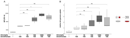These results indicate that transduction efficiencies did not solely depend on the MOI applied. Rather, the overall quantity of the applied vector particles synergistically increased transduction efficiencies, presumably by promoting the uptake of viral particles. A similar synergistic effect was also observed when the cells were transduced simultaneously with Ad-tdTomato (MOI 100) and escalating doses of Ad-empty (MOI 1000: 1.94 ± 0.25-fold, p = 0.021; Figure 5A). A comparable pattern occurred when Ad-tdTomato genomes were quantified; genome copies increased with increasing doses of Ad-empty, although this was not statistically significant (2.69 ± 1.1-fold, p = 0.09; Figure 5B). Therefore, the observed synergistic effect on the transduction efficiencies in a multiple-vector system did not require a time offset.