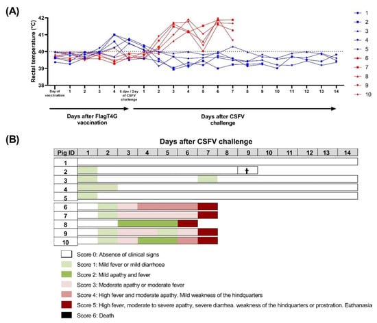 Clinical signs and rectal temperature in pigs during the trial. Individual rectal temperature (A) was recorded in FlagT4G-vaccinated (blue lines and symbols) and unvaccinated (red lines and symbols) pigs throughout the trial. Values above 40 °C (dotted line) were considered as fever. (B) A numeric clinical score value (represented in colorimetric scale) was assigned for each animal after CSFV challenge. Cross symbol indicates an animal that died during monitoring, despite not showing clinical signs.