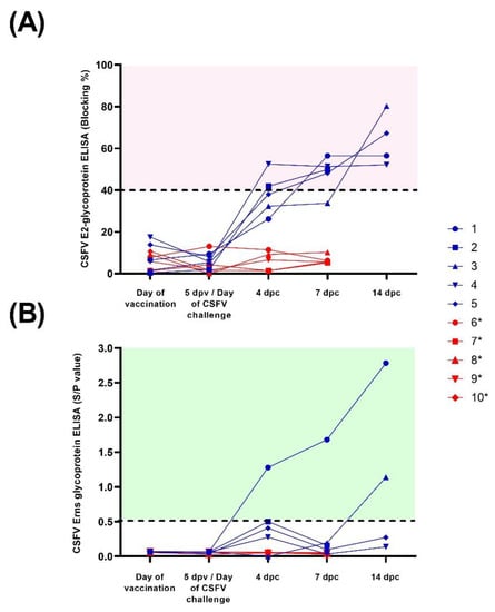 Antibody response after CSFV vaccination and challenge. Sera samples from FlagT4G-vaccinated (blue lines and symbols) and unvaccinated (red lines and symbols) animals were collected and evaluated for antibodies against the E2 (A) and Erns (B) glycoproteins. For the E2 ELISA test, results are expressed as blocking percentage, and values above 40% (red-shaded area) were considered positive. In the case of anti-Erns antibodies, results were expressed as the sample/positive value with samples above 0.5 (green shaded area) determined to be positive. * Euthanized for animal welfare reasons.