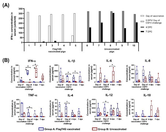 In the group B pigs, significantly higher IL-12 levels were also detected after CSFV challenge (p < 0.05), ranging from 362.9 to 1187.9 pg/mL at 4 dpc, compared to the baseline concentrations before the challenge (between 65.8 and 403.4 pg/mL), (Figure 3B).