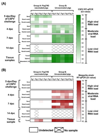 Detection of viral RNA by RT-qPCR. Samples from vaccinated and unvaccinated pigs were evaluated by the pan-CSFV (A) and the specific Margarita strain (B) RT-qPCR assays. Results are shown in a colorimetric scale representing the Ct value in green and red for the pan-CSFV and Margarita tests, respectively.