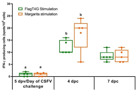 IFN-γ response in FlagT4G-vaccinated pigs. PBMCs from all the experimentally infected animals were stimulated by duplicate with the FlagT4G (green bars) and Margarita (Orange bars) viruses and evaluated by ELISPOT assay. Results are represented as the mean value of spots/106 cells for each stimulation at the respective time points. Unvaccinated and challenged animals remained unresponsive to either of the viral stimuli. Differences between a given sampling and the previous one within FlagT4G-vaccinated pigs (Friedman test) are represented by different letters (p < 0.05).