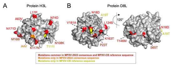 Mapping mutations observed in MPXV-2022 and MPXV-CB on the structure available for VACV (A) H3L [PDB ID: 5EJ0] and (B) D8L [PDB ID: 4E9O] surface proteins. The core structure of each protein is shown in gray, while mutations and their labels are colored according to the scheme in the legend.