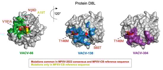 VACV protein crystal structures were obtained from the Protein Databank (www.rcsb.org; accessed on 24 July 2022), and the structural figures were made using PyMOL software (www.pymol.org; accessed on 22 June 2022).