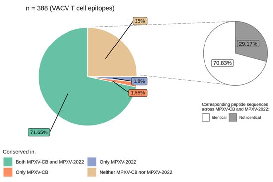 Distribution of the VACV T cell epitopes (n = 388) conserved among MPXV-2022 and MPXV-CB.
