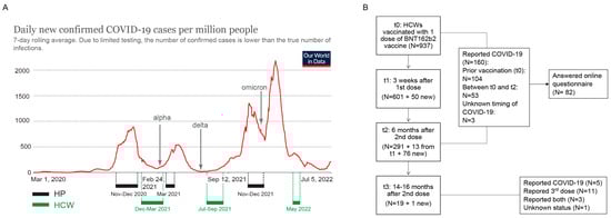 Timeline of serum samples collection and flowchart of HCW cohort enrolment. (A) Intervals of sera collection for hospitalized patients (HP) and healthcare workers (HCW) in relation to COVID-19 pandemic waves in Croatia. (B) Flowchart of HCWs enrolment, follow-up and COVID-19 status. Image in (A) adjusted from Our World in Data.