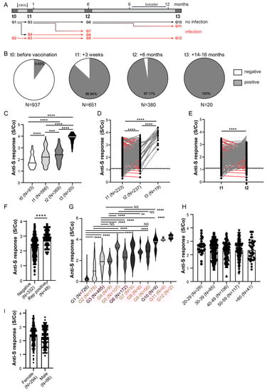 Anti-Spike antibody response in HCW cohort. (A) Schematic of serum collection and groups analyzed in (G) in relation to timing of SARS-CoV-2 infection. (B) Anti-Spike (anti-S) seroconversion rates (above cut-off value) in HCWs at different sera collection time points. (C) Comparison of the anti-Spike antibody response between entire cohort of seroconverted individuals (S/Co > 1.1). (D) Comparison of the anti-Spike antibody response between all paired samples or (E) paired samples that were not Spike seroconverted prior to vaccination or Nucleocapsid protein seroconverted at any time point. Red lines samples displaying reduced anti-S response between t1 and t2 analyses. (F) Comparison of anti-Spike antibody S/Co 6-months post vaccination (t2) stratified to participants’ self-reported PCR confirmed COVID-19 infection. (G) Comparison of the anti-Spike antibody response in relation to timing of infection assessed by Nucleocapisd seroconversion and self-reported, PCR confirmed COVID-19 infection. (H) Comparison of anti-Spike antibody S/Co 6 months post vaccination (t2) stratified to participants’ age or (I) gender. S/Co, Signal to cut-off ratio; dashed line indicates cut-off value (S/Co = 1.1); red lines in D and E show samples with reduction of anti-Spike S/Co; red lines and groups in A and G indicate samples with COVID-19 infection. Statistical tests: ordinary one-way ANOVA followed by Tukey’s multiple comparison test (C,G), mixed effect analysis with Holm-Sidak’s multiple comparisons test (D), paired two-tailed t-test (E,H), p value **** p < 0.0001, p value *** and ** p < 0.05, NS-not significant.