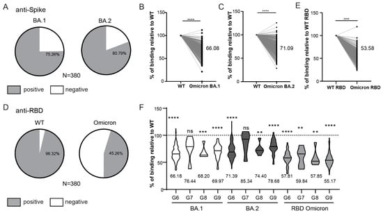 Finally, to assess if demographic factors affect antibody response to vaccination and infection, we compared the S/Co of anti-Spike antibodies on the entire cohort at the time point of 6 months (t2), based on the participants age (Figure 2H) and gender (Figure 2I). Similar anti-Spike response was observed between analyzed age subgroups. Similarly, there was no difference in anti-Spike response between men and women, suggesting no influence of gender, although disproportionate numbers of male and female participants in our cohorts have to be taken into account. The same findings were observed on the smaller cohort analyzed at 14–16 months since vaccination (Supplementary Figure S2A,B). Given the continuous emergence of new SARS-CoV-2 variants escaping humoral immunity, sera collected at 6 months post vaccination (t2) were also tested for their recognition of Spike protein encoded by the Omicron subvariants BA.1 and BA.2 (Figure 3). In contrast to WT Spike protein (Figure 2B) for which 97.11% of sera samples of vaccinated HCWs were positive, 75.26% and 80.79% sera samples were positive for BA.1 and BA.2 Omicron subvariants, respectively (Figure 3A). Furthermore, the binding capacity of anti-Spike antibodies was significantly reduced as compared to the binding to WT protein for most of the analyzed sera (Figure 3B,C), suggesting impaired sensitivity of the Omicron variants to antibodies. This was even more pronounced for Omicron RBD that escaped antibody recognition in more than 50% of analyzed participants (Figure 3D) and that showed a substantial decrease in the binding capacity of anti-Spike antibodies (Figure 3E). When stratifying participants in t2 based on the presence and timing of previous COVID-19 infection (Figure 2A), the capacity of anti-Spike antibodies to bind Omicron BA.1 and BA.2 Spike proteins and RBD protein was significantly reduced in most of the groups when compared to WT Spike and RBD protein, respectively, except for the group with the most recent COVID-19 infection (group G7, Figure 3F). Additionally, the reduction of binding to Spike protein encoded by the Omicron subvariants BA.1 and BA.2 was most pronounced for HCWs that were not infected (group G6, Figure 3F). In line with that, correlation analysis of anti-WT Spike S/Co vs. anti-Omicron S/Co suggested the strongest correlation between groups that had more recent infection, while the lowest correlation was observed, for all variants tested, in the group that had no evidence of prior infection at t2 (Supplementary Table S1). These data suggest that the combination of both previous infection and vaccination could provide better protection against Omicron and that if the infection was more recent protection should be better.