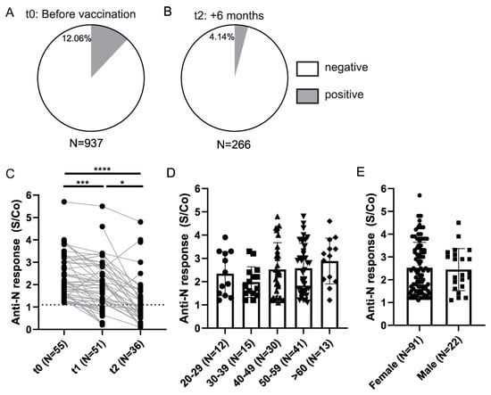Anti-Nucleocapsid antibody response in HCWs. (A) Anti-Nucleocapsid (anti-N) seroconversion rates in HCWs prior to vaccination and (B) 6 months after the full vaccination (t2) (S-positive individuals at t0 and N-positive at t0 and t1 were excluded). (C) Comparison of the anti-Nucleocapsid antibody S/Co between paired seroconverted samples. (D) Levels of anti-Nucleocapsid antibodies in sera of seroconverted individuals at t0 stratified on the basis of age and (E) gender. S/Co, Signal to cut-off ratio; dashed line indicates cut-off value (S/Co = 1.1). Statistical test: Mixed-effects analysis with Tukey’s multiple comparisons test (C), p value **** p < 0.0001, p value *** and * p<0.05.