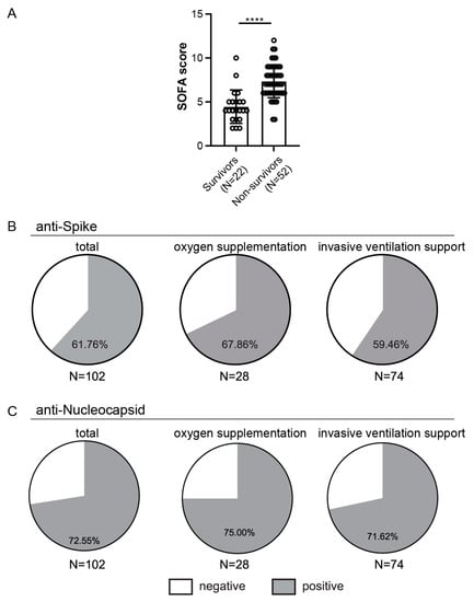 Outcome in relation to SOFA scores and rates of seroconversion in hospitalized patients. (A) Comparison of the SOFA scores between survivors and non-survivors from the invasive ventilation support (IVS) cohort. (B) Presence of anti-Spike or (C) anti-Nucleocapsid antibodies above cut-off value, **** p < 0.0001.