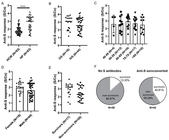 Anti-Spike antibody response in HPs. (A) Comparison of anti-Spike antibody levels between in hospitalized patients (HP) and healthcare workers (HCW) identified prior to vaccination. (B) Hospitalized seroconverted patients were stratified based on the severity of the disease: oxygen supplementation (OS) vs. invasive ventilation support (IVS), (C) age, (D) gender, or (E) mortality outcome for non-vaccinated patients on invasive ventilation support. (F) Frequencies of survivors and non-survivors in relation to anti-Spike seroconversion in IVS cohort. S/Co, Signal to cut-off ratio. Statistical tests: unpaired t-test (A), p value **** p < 0.0001.