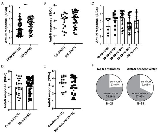 Anti-Nucleocapsid antibody response in HPs. (A) Comparison of anti-Nucleocapsid antibody levels between hospitalized patients (HP) and healthcare workers (HCWs) identified prior to vaccination. (B) Hospitalized patients were stratified based on the severity of the disease: oxygen supplementation (OS) vs. invasive ventilation support (IVS), (C) age, (D) gender, or (E) outcome for patients on invasive ventilation support. (F) Frequencies of survivors and non-survivors in relation to anti-Nucleocapsid seroconversion. Statistical tests: unpaired t-test (A), p value *** p < 0.0005. S/Co, Signal to cut-off ratio.