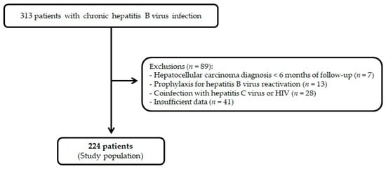 A total of 313 medical charts of patients diagnosed with HBV were evaluated, and, after exclusion criteria, 224 patients were included in the study (Figure 1).