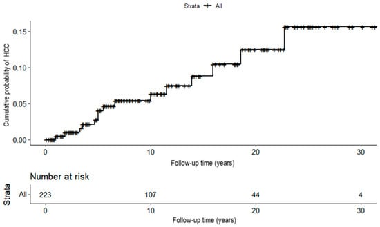 Worldwide, regardless of endemicity, chronic hepatitis B prevalence is higher in males, and this factor is related to prognosis, such as the increased risk of HCC, cirrhosis, and death [5,7,26,27]. This is probably due to the greater replication of HBV in men and may reflect higher-risk sexual behavior and/or hormonal phenomena [27,28]. The present study population profile consisted of mostly men around 40 years old, which is in line with larger cohorts, such as those from the Korean National Health Insurance Service database composed of 317,856 patients [29]. The authors reported a global HCC prevalence of 5.93% after a median follow-up of 8.5 years. Despite having almost the same follow-up time, the occurrence of HCC was slightly lower than in the present study. Including fewer patients with cirrhosis than our study population (10.1% vs. 21.9%), a known risk factor for HCC, could have impacted HCC prevalence over time [29,30,31].