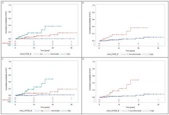 Cumulative probability of hepatocellular carcinoma stratified by the scores. (A): Initial PAGE-B; (B): initial PAGE-B (1 = low + intermediate risk, 2 = high risk)—Log rank p = 0.0001; (C): initial mPAGE-B—Log rank p < 0.0001; (D): initial mPAGE-B (1 = low + intermediate risk, 2 = high risk)—Log rank p < 0.0001. HCC: hepatocellular carcinoma.