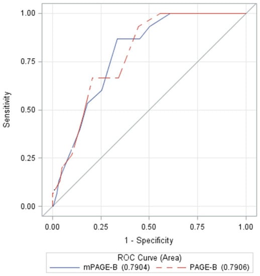 ROC curves of the initial PAGE-B and mPAGE-B scores (p = 0.9767). ROC: receiver operating characteristic.
