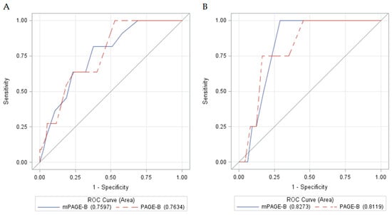 ROC curves of the initial PAGE-B and mPAGE-B scores stratified by HBV treatment during follow-up. (A): Patients that received HBV treatment (p = 0.9451); (B): patients without treatment during follow-up (p = 0.8138). HBV: hepatitis B virus; ROC: receiver-operating characteristic.