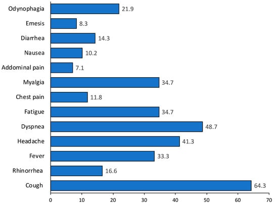 On the other hand, the more common symptoms were cough (64.3%), dyspnea (48.7%), headache (41.3%), fatigue (34.7%), and myalgia (34.7%) (Figure 1).