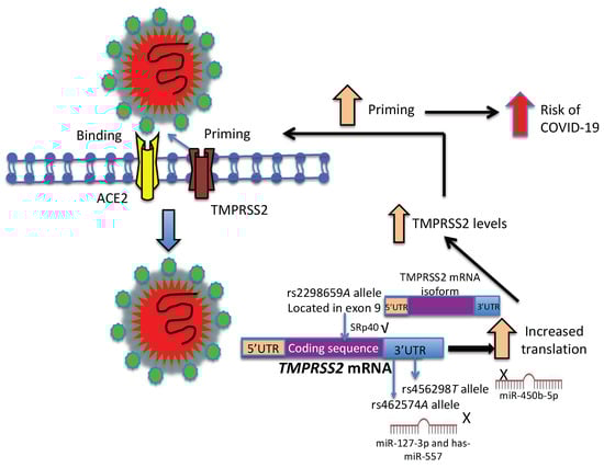 Hypothesis based on in-silico analysis of three SNPs located in the TMPRSS2 gene. TMPRSS2 can cleave the S protein and thus facilitate the entry of SARS-CoV-2 into the cell. According to in-silico analysis, the A allele of rs2298659G/A could create a binding site for SRp40, a splicing protein involved in the generation of protein isoforms (20 mRNA isoforms have been described). The rs456298A/T and rs462574G/A polymorphisms (located in 3′ UTR) could create binding sites for miR-450b-5p, miR-1324, and miR-127-3p/miR-557. The rs456298T allele of TMPRSS2 could disrupt the binding site for miR-450b-5p, whereas the rs462574A allele could disrupt the binding sites for miR-127-3p and miR-557. These alleles could increase the TMPRSS2 protein levels with the consequent increase in priming of the spike protein. This fact could facilitate the entry of SARS-CoV-2 into the cell and increase the risk of COVID-19.