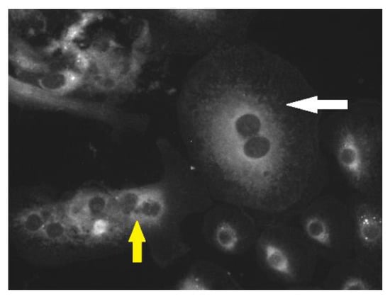 Uninfected embryonic cockatiel brain cells, including a large pleomorphic cell with two nuclei (white arrow) alongside smaller cells with multiple nuclei (yellow arrow).