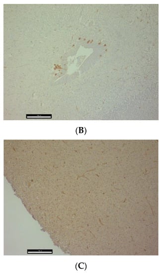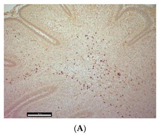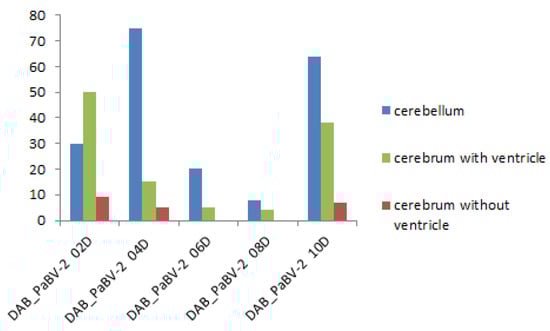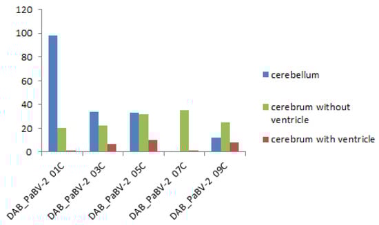 In group 2, there were significantly more PaBV-4 antigen-positive cells in the cerebellum than the cerebrum without ventricles (U = 2, p = 0.00034). There was not a significant difference in the PaBV antigen distribution between the cerebellum and the cerebrum with ventricles (U = 44.5, p = 0.70394). There were significantly more PaBV antigen-positive cells in the cerebrum with ventricles than the cerebrum without ventricles (U = 8.5, p = 0.00194) (Figure 5).