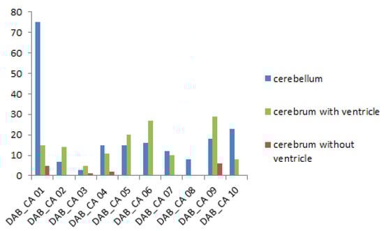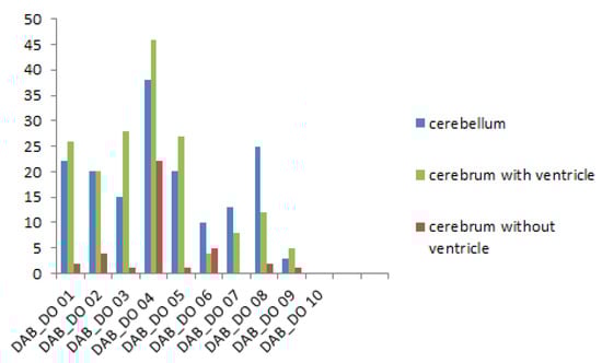 Parrot bornavirus (PaBV) antigen distribution in the brain of trial B group 1 (PaBV-4 inoculation in the yolk sac). The y-axis shows the number of PaBV antigen-positive cells counted in one slide (200× total magnification). PaBV antigen was mainly found in the cerebellum and cerebrum with ventricles, and much less frequently in the cerebrum without ventricles. The x-axis shows each individual embryo (n = 10, laboratory number).