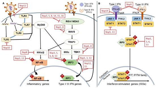 - Vazquez, C.; Swanson, S.E.; Negatu, S.G.; Dittmar, M.; Miller, J.; Ramage, H.R.; Cherry, S.; Jurado, K.A. SARS-CoV-2 Viral Proteins NSP1 and NSP13 Inhibit Interferon Activation through Distinct Mechanisms. PLoS ONE 2021, 16, e0253089. [Google Scholar] [CrossRef]