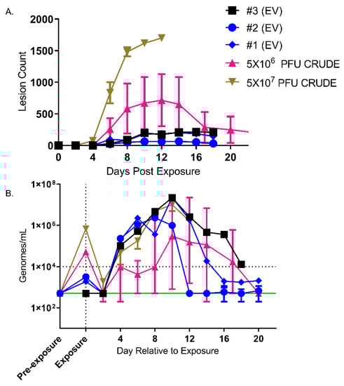 Assessment of lesion burden and QPCR. Lesions (A), viremia (QPCR) (B) over time are shown. Mean with standard error of the mean is shown for lesion counts (A) and median and error are shown for QPCR data (B). Animal #3 (EV) was shown to have extravasation of the challenge inoculum and is shown in black (square symbol). Green line, lower limit of detection. Horizontal dotted line, lower limit of quantitation. Blood obtained previous to exposure is shown on the X-axis as “Pre-exposure”. Blood obtained within 2 min of intravenous exposure was on Day 0 and is shown on the X-axis as “Exposure”.